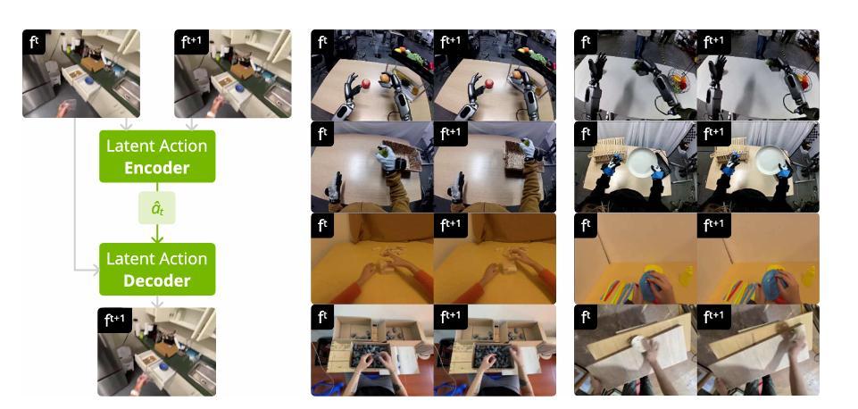 通過這種設計,潛在動作成爲了連接人類視頻與機器人控制的通用橋樑。在預訓練階段,模型通過自我監督的方式,學習如何從像素變化中推斷出潛在動作,並利用這些潛在動作預測下一幀畫面。