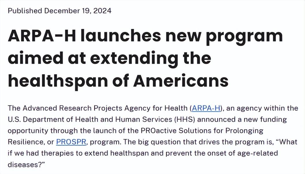 除了市場的積極推進,美國政府機構先進研究項目局-健康部門(ARPA-H)於 2024 年 12 月啓動了一項新的長壽倡議,旨在尋找可用於測試抗衰老幹預的臨牀試驗的黃金標準生物年齡時鐘。
