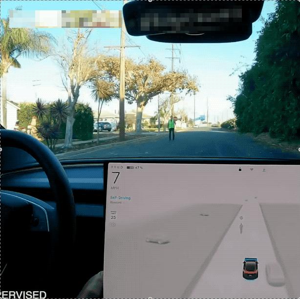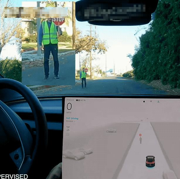 而另一個用戶發佈的測試視頻裏,一個穿着反光背心的交通指揮員拿着STOP的牌子站在路上,特斯拉識別到停車標識後停下了。停車一段時間後,指揮員左手舉的牌子沒有放下,但是右手示意可以通過,車子成功識別到了信息並往前行駛。