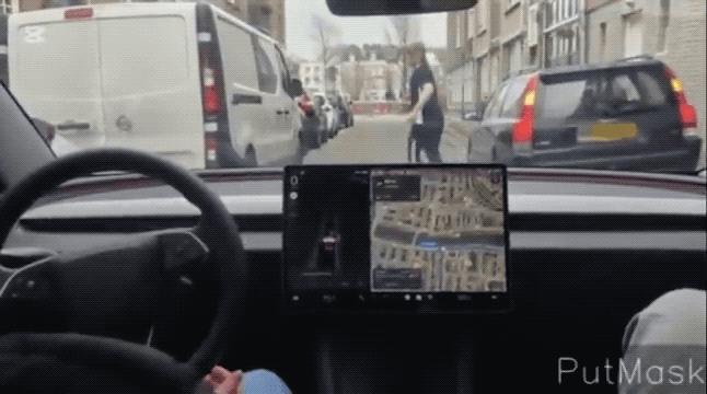 在被官方轉發的視頻裏,特斯拉行駛在荷蘭的一條狹窄街道上,路兩邊都停了車,而路中間一老哥在車外指揮車子往前開。