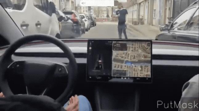當老哥向車子招手示意可以往前時,特斯拉便自動往前擠,直到車子認爲不放心的地方就停下了。老哥把右邊黑車的後視鏡收起來後再做手勢示意車子往前,車子又往前擠了一段,最後猶猶豫豫地通過了。