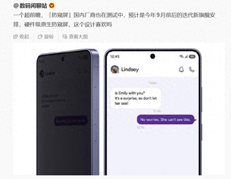 根據數碼閒聊站的報道,目前國內廠商也在測試硬件級原生防窺屏,預計在今年9月前後迭代的新旗艦上就會看到。