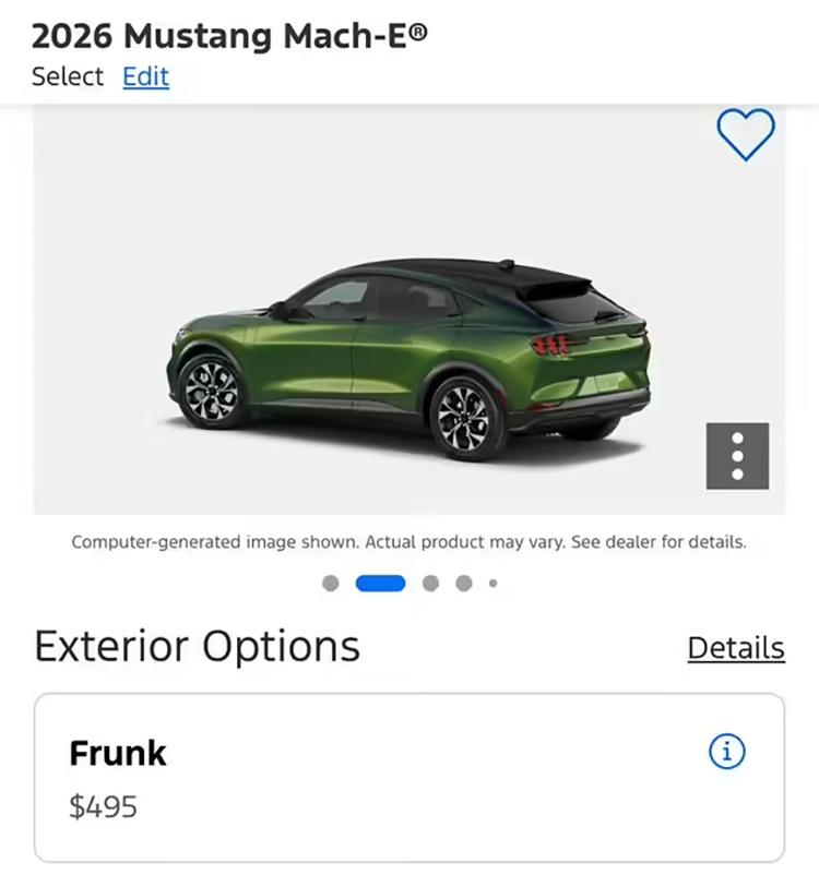2月25日消息,此前,作爲區別於燃油車的標誌性福利,福特電馬Mustang Mach-E在營銷過程中,都將其前備箱作爲車輛的一大亮點,並將其稱作露營派對神器。然而,福特在全新的2026款Mustang Mach-E做出一點改變,將前備箱調整爲選配項,並且價格爲495美元。