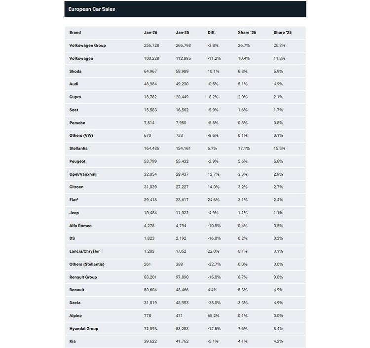 進入2026年,歐洲的新車市場在開局就迎來了不利局面。根據歐洲汽車製造商協會的數據顯示,1月整個歐洲地區的新車註冊量爲961382輛,同比下滑3.5%。