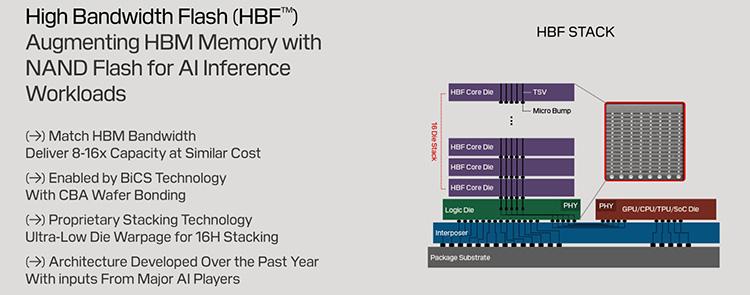 HBF並非是HBM的替代品,而是介於HBM和SSD之間的全新層級。容量上比HBM大得多(8-16 倍),帶寬又遠高於SSD的中間層,同時成本上還比HBM低得多。它可以直接與AI服務器緊密集成,就像一個超大容量的“近處理器緩存”,讓服務器能快速訪問海量數據,減少等待SSD的時間。
