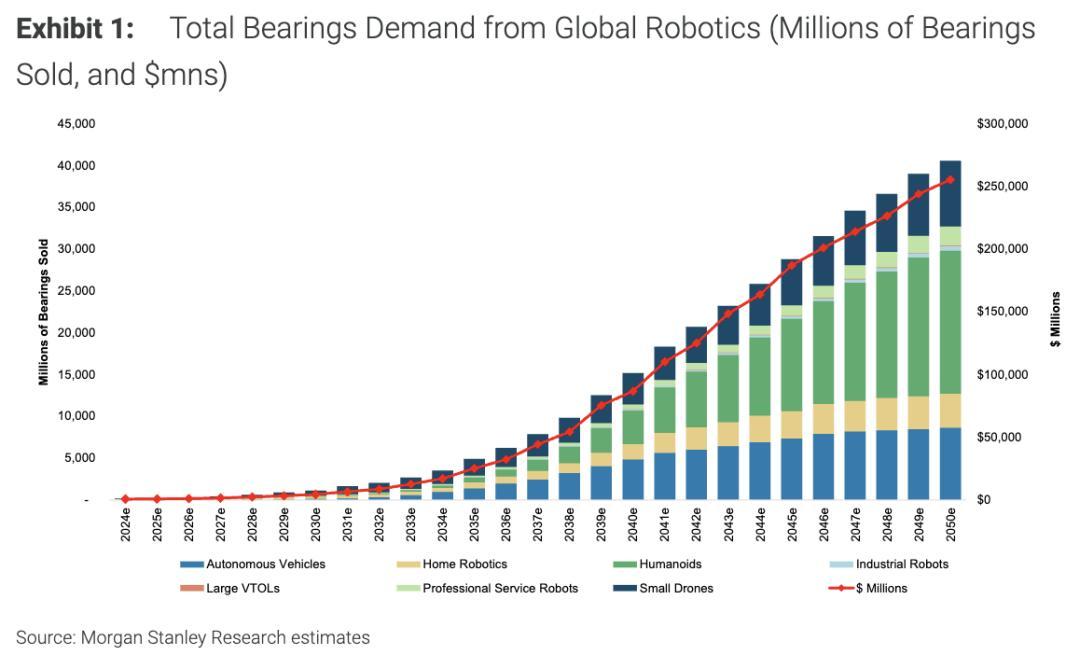 這組數據看起來相當激進。但它背後的邏輯並不複雜:摩根士丹利此前的研究預測,到 2050 年全球機器人裝機量可能達到約 65 億臺,涵蓋家用機器人、小型無人機、人形機器人、自動駕駛汽車、工業機器人、專業服務機器人和大型垂直起降飛行器(VTOL)等多種形態。如果每臺機器人平均消耗數十個軸承,總量確實是天文數字。