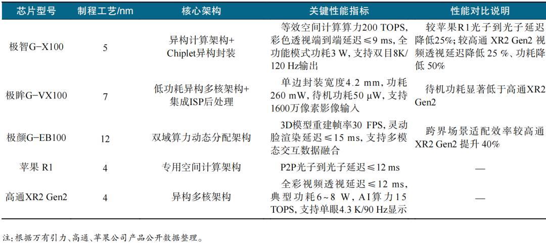 專用協處理芯片是推動XR硬件性能升級與形態創新的關鍵支撐。在XR專用協處理芯片架構(以蘋果R1爲代表)提出之前,全球XR設備的核心算力支撐多依賴高通XR系列等通用架構的XR專用移動處理器,存在算力供給、功耗控制與場景適配性失衡等痛點。2025年,國內的萬有引力科技有限公司推出極智G−X100等3款自主研發的空間計算專用協處理器,通過製程工藝迭代、異構架構設計與場景化算力分配優化,實現高性能與低功耗核心突破,標誌着國產空間計算專用協處理器芯片正式邁入“高性能−低功耗”協同進化新階段。