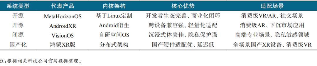 從“內核架構−核心優勢−適配場景”3個維度對2025年XR操作系統4大核心陣營展開對比:開源系統以“生態開放、跨設備兼容”爲核心競爭力,側重消費級與下沉市場覆蓋;閉源系統聚焦“沉浸式體驗與隱私保護”,瞄準高端專業領域;國產化系統突出“國產硬件適配與低延遲”,填補本土XR設備軟件生態空白,各陣營形成差異化互補格局,核心優勢對比如表3所示。