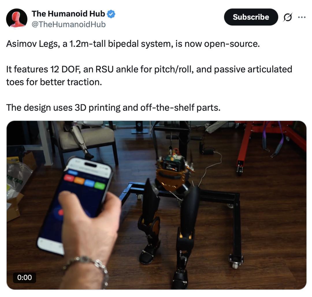 值得一提的是,Menlo Research 的明確目標是打造增強人類能力的勞動力平臺。從起步階段,Asimov 機器人就以“公開構建”的方式推進,目前已開源了其雙腿模塊設計和仿真文件,並在 Discord 社區中持續更新進展。