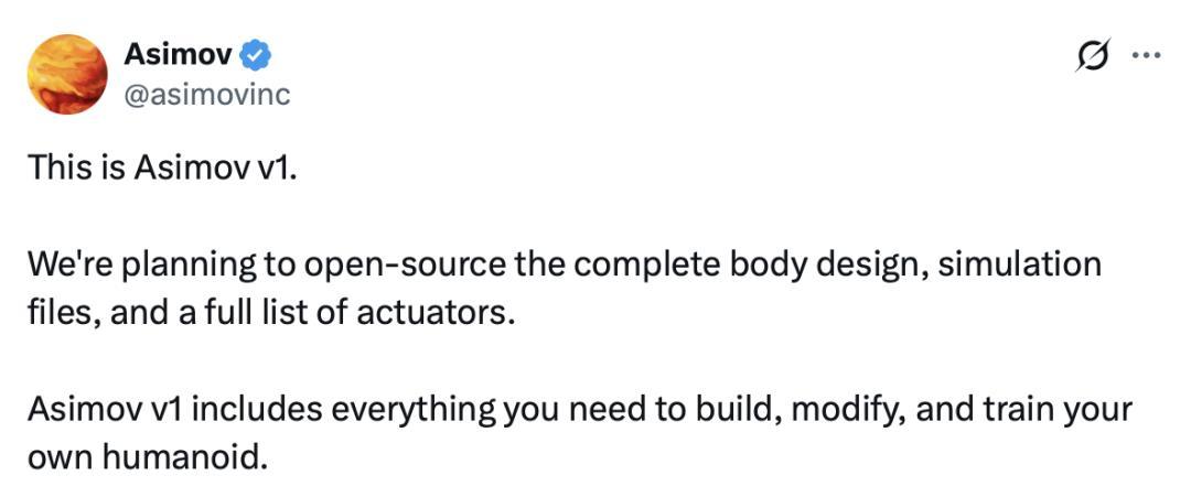 與此同時,由 Menlo Research 社區推動的 Asimov 項目宣佈:其研發的人形機器人 Asimov v1 即將開源完整身體設計圖、仿真文件,以及執行器清單和可自由修改的零件列表。項目發佈者表示,這個開放設計提供了“完整搭建、修改和訓練自己人形機器人的所有必要資源”。