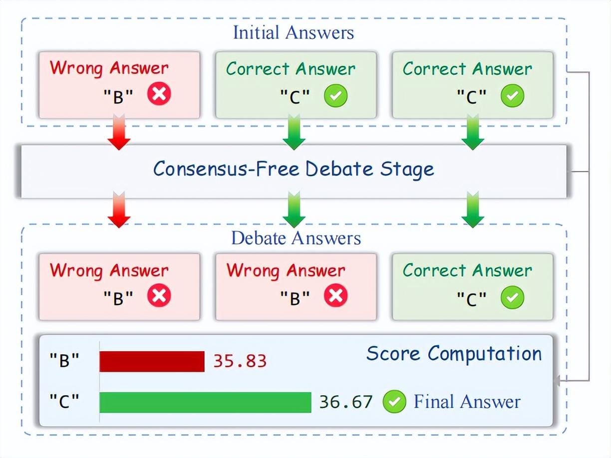 這種決策邏輯帶來的好處是,無需在辯論階段達成共識,即便正確答案在末輪未獲得多數投票,系統仍可能基於它在辯論過程中的穩定表現或合理轉變而獲得結論。
