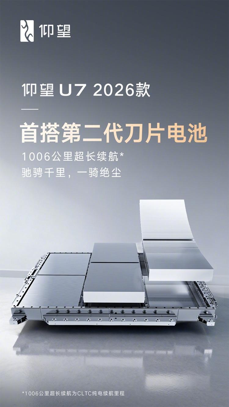 目前已知,2026款仰望U7將成爲首款搭載第二代刀片電池的車型,其電池容量不僅拉到了驚人的150kWh,更在CLTC工況下實現了1006公里的超長純電續航。