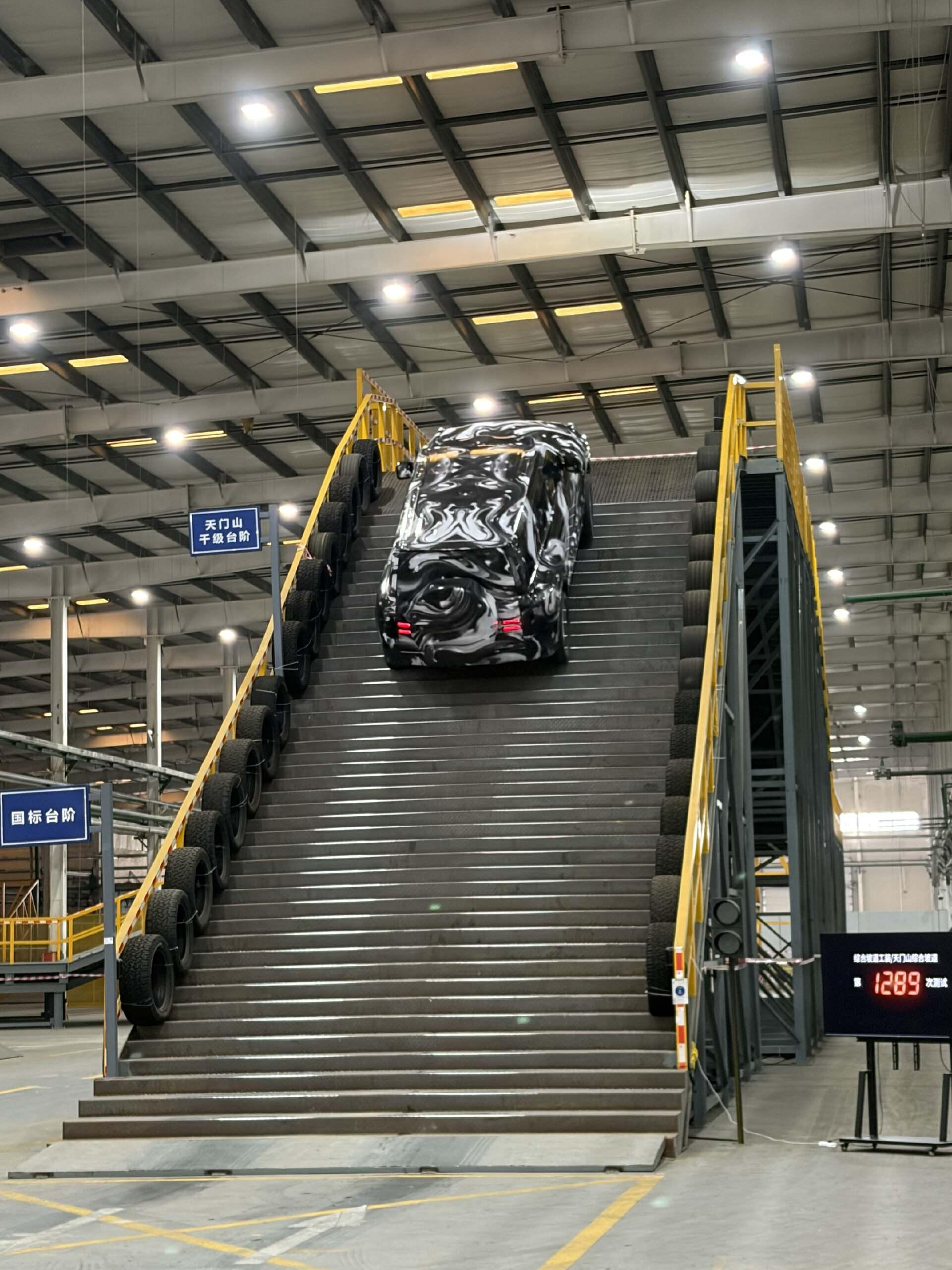 還有一點就是,由於路面都是階梯,起伏很大,在駕駛的時候車輛會因爲彈跳而導致偏移或者後溜,這就相當危險了,這對於汽車懸掛系統和轉向系統又是很大的挑戰。所以說,比亞迪把天門山天梯搬進了廠房,這是一項難度很高的挑戰。