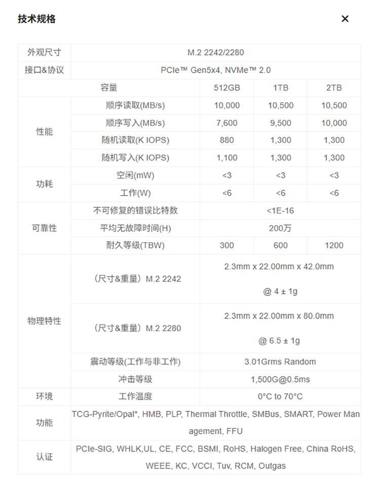 耐用性方面,512GB/1TB/2TB 的耐久度分別達到300/600/1200TBW,平均無故障時間爲200萬小時,可充分保障設備長期運行下的數據穩定性。