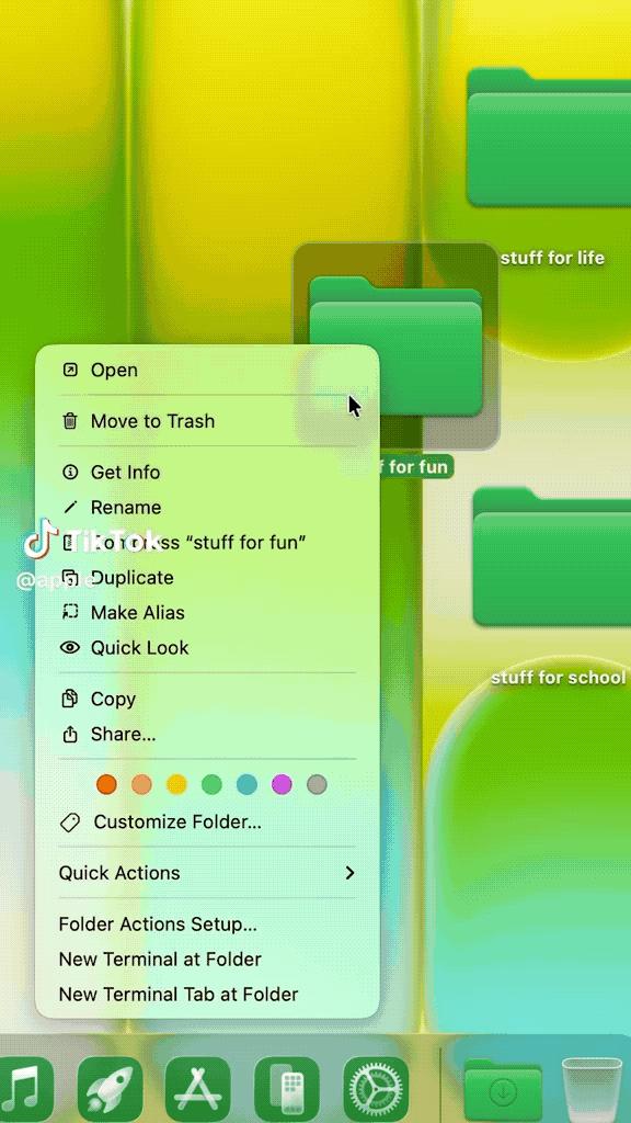 比如這個視頻,配音說她喜歡青檸色,把桌面所有文件夾的封面改成了水果,底部Dock欄圖標的顏色都改成了青檸,這看起來好像還好。