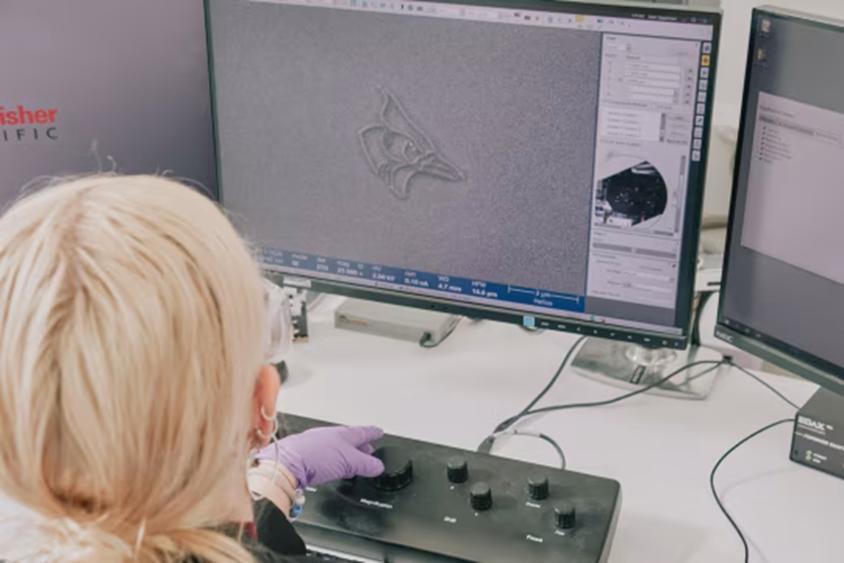 圖 | Waltz展示了她和團隊使用本次工藝刻蝕出一隻藍色知更鳥的圖案(來源:資料圖)
