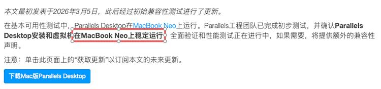在3月12日,Parallels在公告中表示,他們的工程師團隊完成初步測試後,確認Parallels能在MacBook Neo上穩定運行Windows系統,既能在iPhone上面跑iOS,又放到筆記本電腦上跑macOS,還順便能兼容Windows,這顆A18 Pro手機芯片的人生真的是圓滿了。
