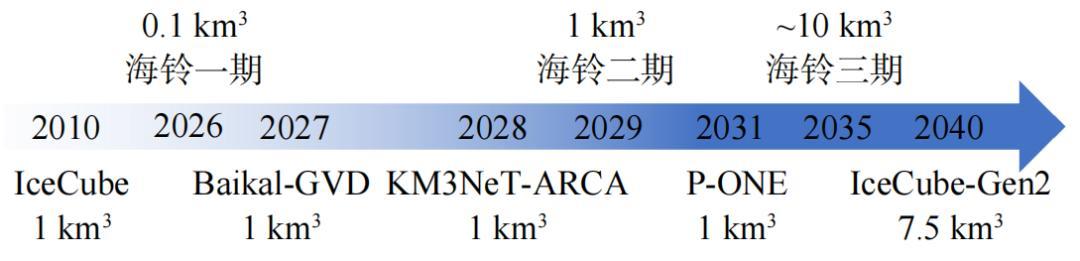 爲了角逐這些重大科學機遇,歐美主要發達國家正密鑼緊鼓推進下一代中微子望遠鏡的建設,包括IceCube−Gen2、KM3NeT、Baikal−GVD、P−ONE等。中國也在推動建設下一代中微子望遠鏡,包括海鈴望遠鏡(TRopIcal DEep−sea Neutrino Telescope,TRIDENT,以下簡稱“海鈴”),以及高能水下中微子望遠鏡(High−energy Underwater Neutrino Telescope,HUNT)、南海中微子天文臺(NEutrino Observatory in the Nanhai,NEON)等。