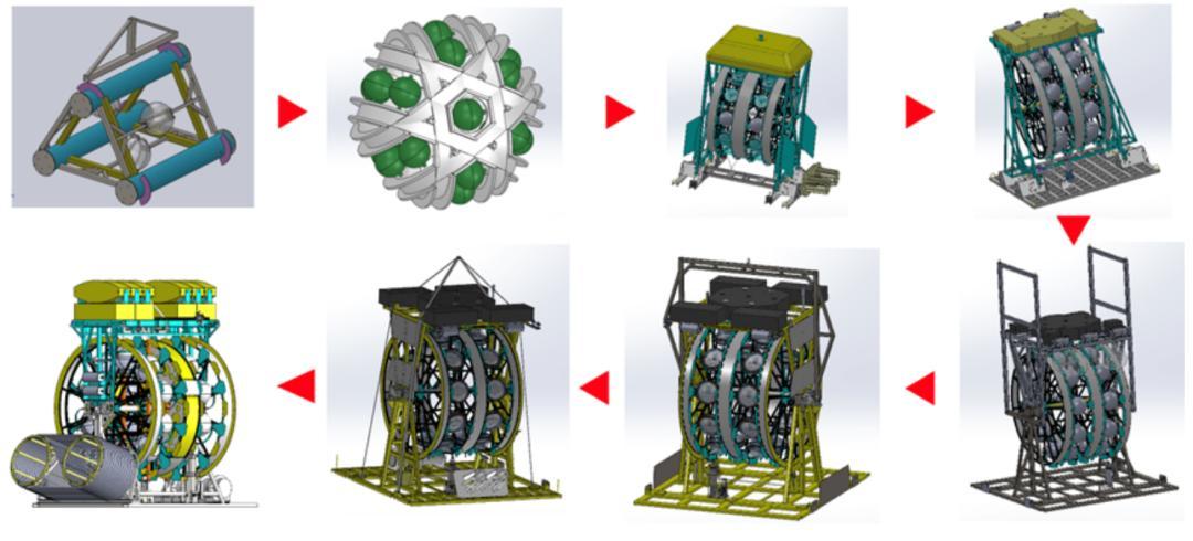 圍繞上述工程瓶頸,2020年以來,海鈴團隊在如何進行深海精準布放方面進行了大量設計和設備迭代工作。經過多年研發,海鈴團隊提出並實現了以“蜘蛛”系統(SPIDER−subsea precision instrument deployer with elastic releasing,深海精密儀器柔性布放裝置,圖9)爲核心的整體布放技術路徑。“蜘蛛”系統利用可擴展的捲筒結構,以“水車式”集成方式對光學球艙和線纜進行集裝,使得在具體施工時可以將整個捲筒結構先放置於海牀預定位置後,再對串列進行釋放展開,以實現望遠鏡串列在深海精準布放的目的。