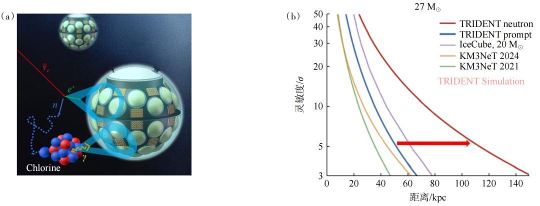 圖7 hDOM 對超新星 MeV 中微子探測原理示意(a)及海鈴對超新星的探測靈敏度(b)