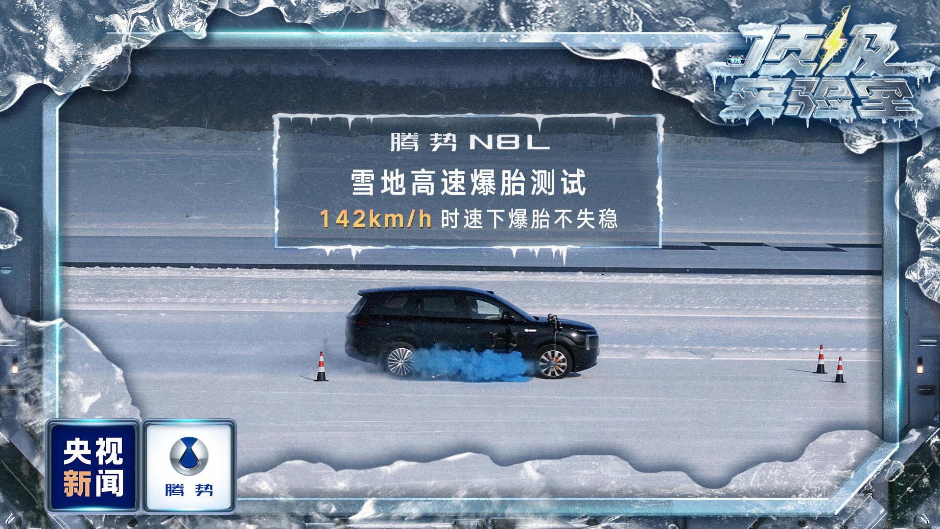 再說說安全感,這纔是開車最關鍵的!央視這次還搞了個首次測試——雪地高速爆胎,想想都嚇人,雪地裏開快了都容易滑,更別說爆胎了,結果騰勢N8L直接以142km/h的速度,爆胎後還能穩穩控制,不側翻、不甩尾,創下了全球最高紀錄!
