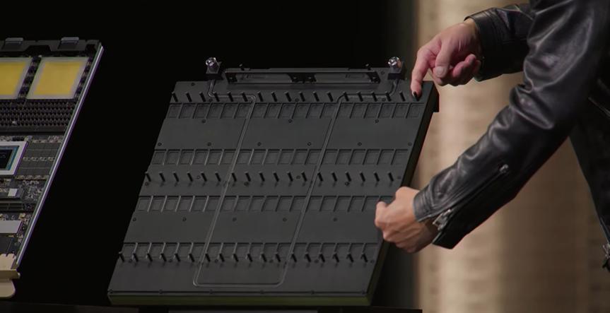 Rubin Ultra 是 Rubin 平臺的高性能版本,採用全新的 Kyber 機架設計。與 Rubin 水平插入不同的是,Rubin Ultra 採用垂直插入機架,每個 Kyber 機架能夠連接 144 個 GPU 形成一個 NVLink 域。黃仁勳現場展示了 Rubin Ultra 的實物,只見他雙手拎起也頗顯費力,並且這個重達數百公斤的大傢伙必須得小心搬動。
