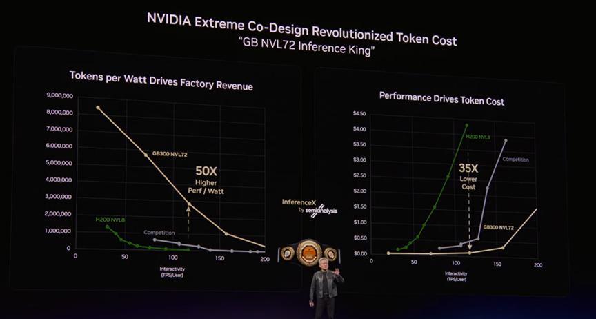 據瞭解,Rubin Ultra 芯片即將流片,配合 LPDDR35 內存,並將首次融入英偉達的 NVFP 計算結構,帶來數倍的性能加速。黃仁勳解釋說,Rubin Ultra 解決了高吞吐量和低延遲之間的矛盾。高吞吐量需要大量浮點運算,低延遲需要巨大帶寬。兩者本是敵人,但是通過極致協同設計,Rubin Ultra 在最需要高性能的推理層級實現了 35 倍的提升。而如果需要更高速度的 token 生成,還可以加入 Groq 芯片協同工作,將性能推向新的高度。