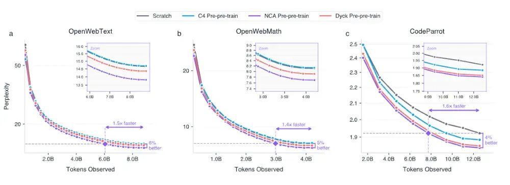 但實驗結果顯示,在這些純粹的“動態圖案”上訓練過的模型,在隨後的自然語言學習中表現得更好,困惑度(perplexity)降低了最多 6%,收斂速度加快了最多 1.6 倍。更讓人意外的是,僅用 1.64 億個細胞自動機 token 做預訓練,效果竟然超過了用 16 億個真實英語文本(來自 Common Crawl 數據集 C4)做同樣的預訓練。