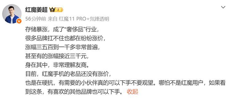就在大家都宣佈漲價的時候,紅魔姜超今天社交平臺上宣佈,非常理解友商,但目前紅魔手機老品還沒有漲價,依舊在硬抗。