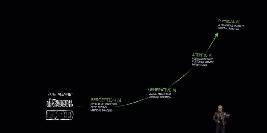 2025 年,黃仁勳在重返 CES 主舞臺的主題演講中,系統梳理了 AI 的演進路徑,並提出“物理 AI”概念 —— 過去十幾年,AI 經歷了感知 AI(讓機器學會“看”)、生成式 AI(讓機器學會“寫”和“畫”)兩個階段,現在正在進入第三個階段:物理 AI(Physical AI)。