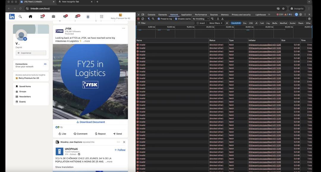 圖 | Chrome 開發者工具中捕捉到 LinkedIn 擴展掃描(來源:BrowserGate)