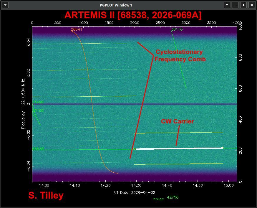 在“阿耳忒彌斯 2 號”發射後的次日午夜,飛船在特定時段升起。四位入選者之一的斯科特·蒂利(Scott Tilley,呼號 VE7TIL)從距離地球約 7.5 萬公里的太空中,成功捕獲了第一批無線電多普勒數據。在他的頻率-時間圖表上,飛船的信號呈現爲一條形如“意大利麪”的反 S 形下降橙色曲線。