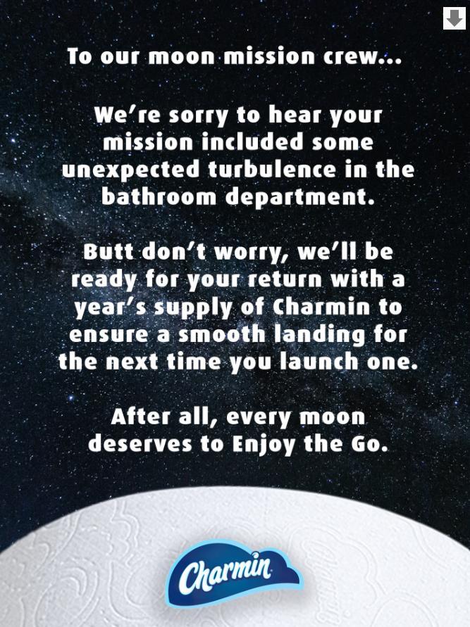 “致我們的繞月任務機組……聽說你們在‘衛浴部門’遭遇了一些意料之外的‘顛簸’,我們深表同情,”Charmin 寫道,“但(腚)別擔心,我們已經爲各位凱旋準備了一整年的 Charmin 紙巾,保準讓你們下次‘發射’時能有個順滑的着陸。畢竟,每一輪‘明月’都值得享有舒心的排遣。”