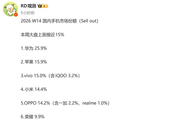 暢享90 Pro Max的熱銷,也讓華爲在第14周的國內市場份額來到了25.9%,領先第二名的蘋果整整10個百分點。