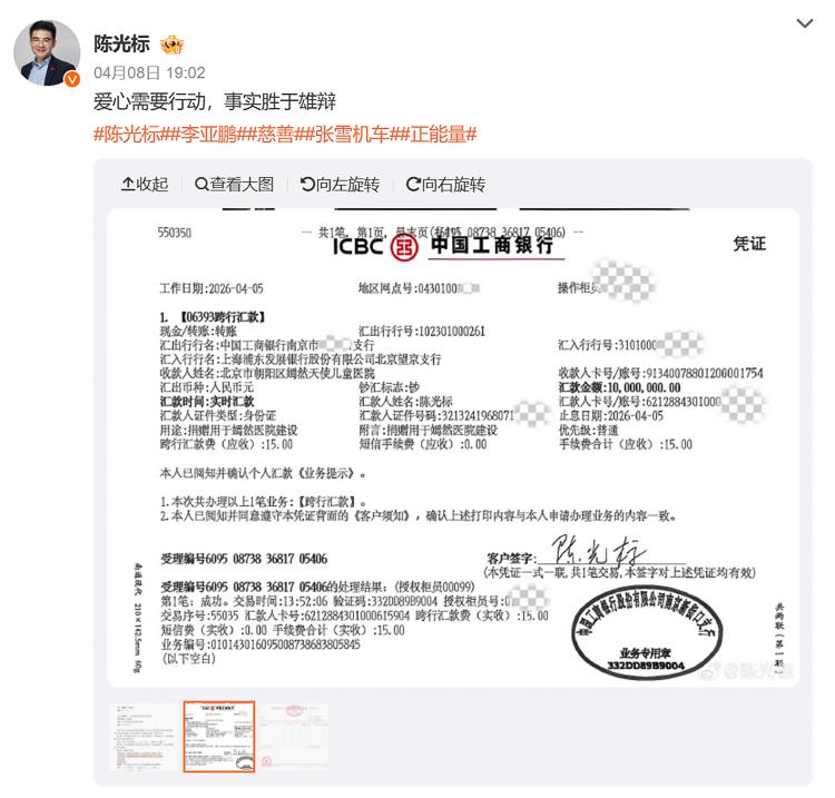 後來陳光標雖然未能將勞斯萊斯贈送給張雪,但是曬出了給嫣然醫院的1000萬元捐款截圖。