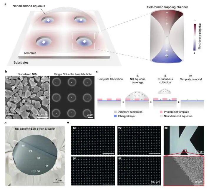 近期,香港大學副教授褚智勤團隊與南方科技大學、韓國科學技術院等團隊合作,提出了一種基於靜電捕獲的方法,首次實現了在 8 英寸晶圓上陣列化排布單個納米金剛石,良率達 82.5%。這種方法操作簡便,單次操作僅需 5 分鐘,且與成熟的 CMOS(互補金屬氧化物半導體)工藝線兼容。