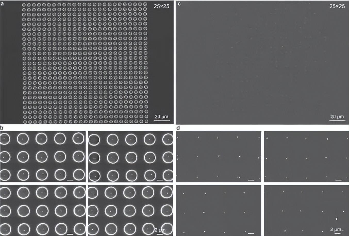 爲此,研究人員嘗試了一種簡單而反常規的方法:用標準的光刻工藝製備帶有微米級圓孔的掩膜板,掩模材料採用常規的光刻膠,塗覆和去除非常方便。
