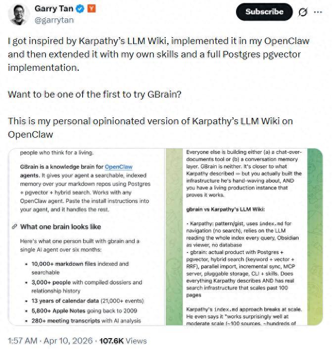 這一思路與 Andrej Karpathy 近期關於“LLM 知識庫”的工作異曲同工。Karpathy 主張用 LLM 充當“全職研究館員”,取代傳統 RAG(檢索增強生成)管道中低效的即時拼湊模式。在 4 月 10 日的推文中,Tan 明確提及了 Karpathy 的工作對他的啓發。