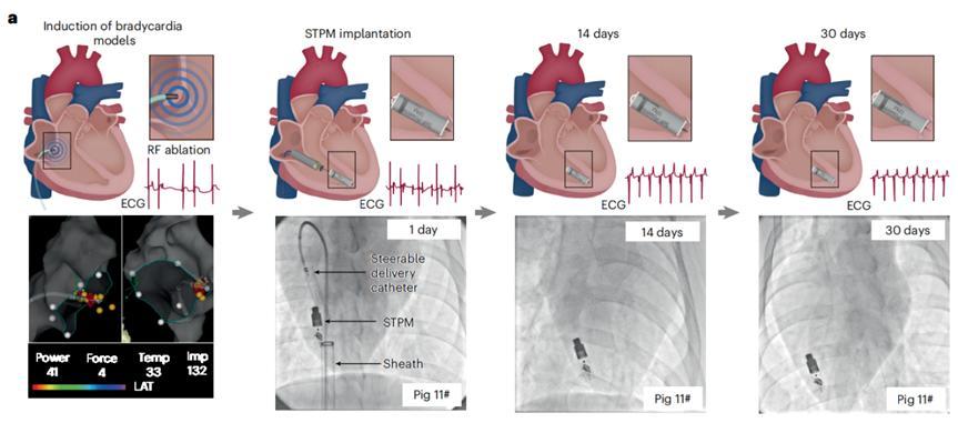起搏器植入後,豬的心率穩定在預設的 98 次每分鐘,血壓回升到 110/70 毫米汞柱,射血分數從 43% 提高到 61%。術後 1 天、14 天和 30 天,起搏器一直在工作,心電圖上的起搏尖峯清晰可見。組織切片檢查顯示,起搏器與心肌結合良好,沒有明顯的炎症反應。