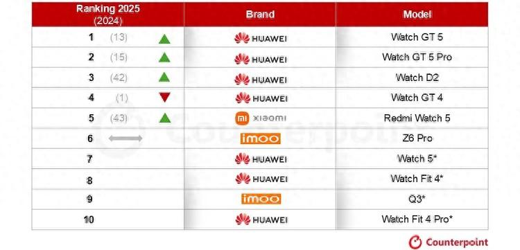 根據Counterpoint Research的調研數據,2025年,華爲在國內智能手錶市場獲得了42%的份額,而單品銷量前十的機型中,華爲更是有7款手錶上榜,成爲最大贏家。