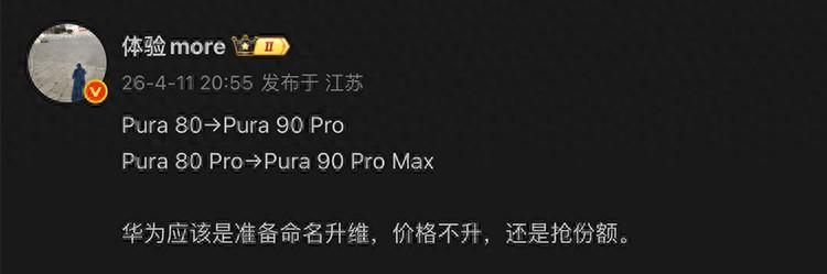 博主@體驗more 昨晚表示,華爲Pura 90系列將“命名升維但不漲價”,命名升維是什麼意思呢?博主按照上圖舉了個例子,也就是標準版變Pro,Pro變Pro Max,這就有點不對勁了。“命名升維”是高情商說法,但小編和部分網友情商比較低,覺得這應該叫做“變相降級”。