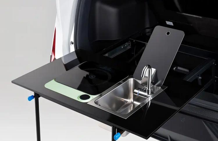 真正讓我覺得有點意思的是後備廂廚房套件。集成不鏽鋼操作檯面、2200瓦電磁爐,外加14升水箱,還支持3.3千瓦對外放電,做飯不用再帶卡式爐和備用電源了。這套廚房系統是目前新能源車上比較少見的原廠選裝方案。