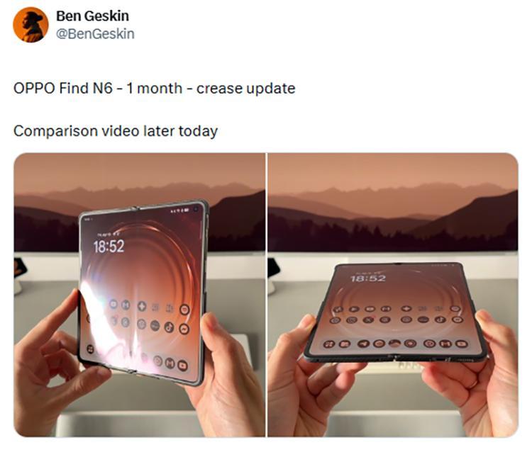 根據國外科技博主Ben Geskin的使用體驗,OPPO N6在使用一個月後,在強光的環境下,已經可以看出較爲明顯的視覺摺痕,但是相比上一代的OPPO N5表現還是會好一些。不過,當指尖劃過內屏時,中央的摺痕在實際觸感上幾乎無法感知。