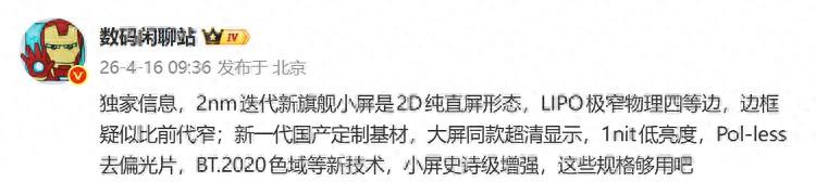 根據數碼閒聊站的爆料,某2nm迭代新旗艦小屏將採用2D純直屏形態,LIPO極窄物理四等邊,邊框疑似比前代窄。