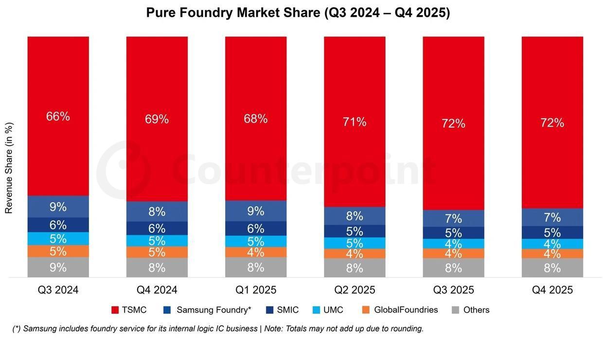 先給大家看一組扎心的數據,就知道現在全球芯片格局有多懸殊。2025年全球晶圓代工廠的市場產值裏,臺積電一家就佔了72%,相當於壟斷了大半個市場。韓國三星排第二,只有7%。我們的中芯國際排第三,僅佔5%。