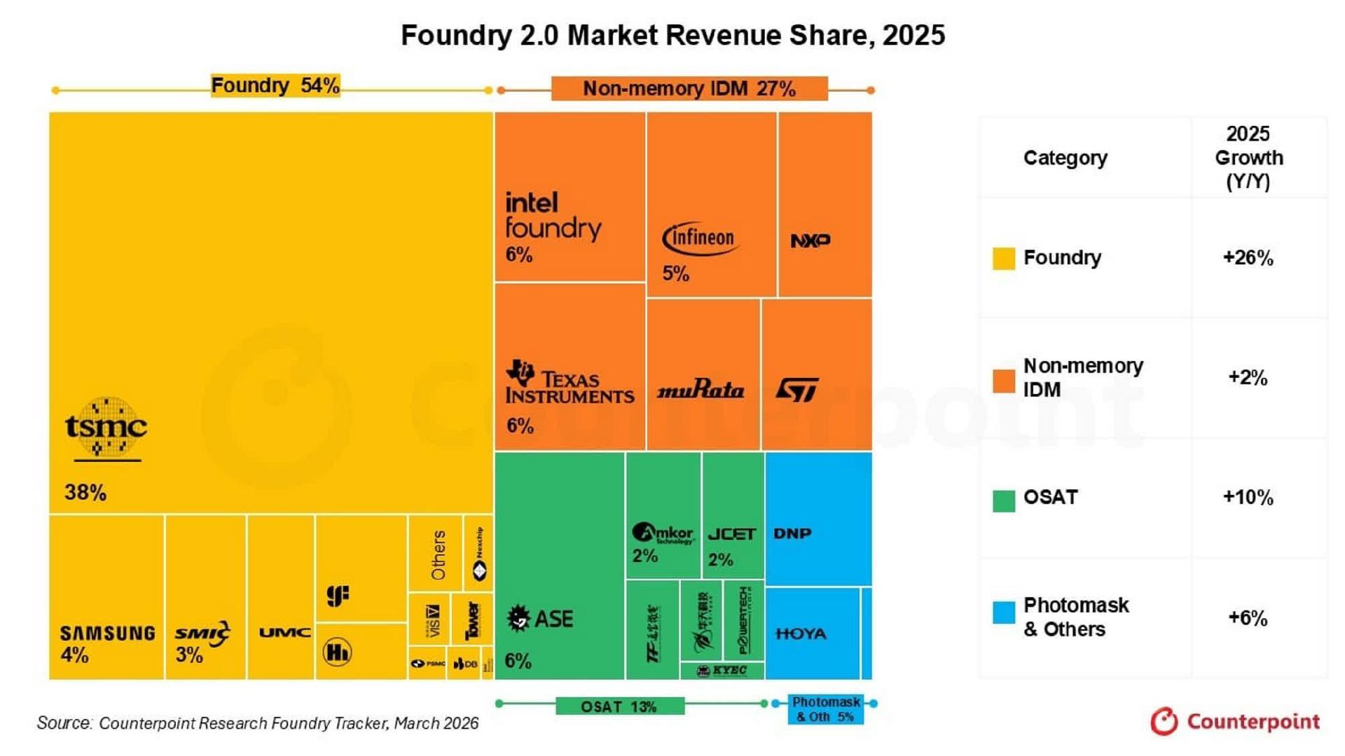 要是看營收更直觀,臺積電在全球純晶圓代工廠裏,營收佔比高達38%,而三星只有4%,中芯國際更是隻有3%。說白了,臺積電幾乎喫掉了全球九成以上的先進邏輯芯片和AI芯片產能,我們能分到的,只是一些中低端市場的“殘羹剩飯”。