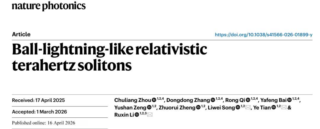4 月 16 日,來自中國科學院上海光學精密機械研究所的一支研究團隊,在國際頂級期刊《自然·光子學》(Nature Photonics)上發表論文,報告他們首次在實驗室中可控地生成了一種具有球狀閃電典型特徵的宏觀電磁孤子。這個發光的等離子體球,直徑達到毫米量級,存活時間超過 100 納秒,會發出從紫外到紅外的寬譜輻射,還呈現出與元素電離過程對應的特徵光譜線。