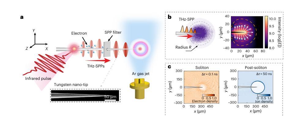 研究團隊使用一束飛秒激光脈衝,照射到一根頂端曲率半徑僅約 50 納米的鎢金屬針尖上。激光在針尖表面激發出太赫茲表面等離子體極化激元(Surface Plasmon Polaritons,SPP,一種沿金屬表面傳播的電磁波模式)。這些 SPP 沿着金屬絲向針尖傳播,在尖端發生極端的空間壓縮,電場強度被增強到超過 100 億伏每米,達到了所謂的“相對論性”強度,此時的電場強到足以將電子加速至接近光速。