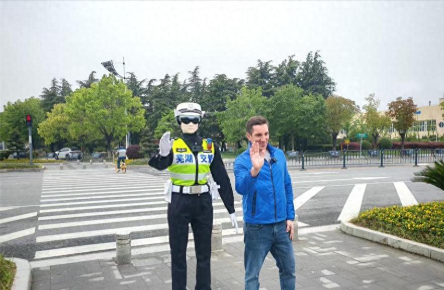 近日,西班牙遊客湖長明在蕪湖古城閒逛的時候,遇到了一個身穿交警反光背心的機器人。這位西班牙小哥當場就愣住了,盯着那個筆直站立、手勢規範的機器人看了好一會兒,然後掏出手機請求合影。湖長明後來對媒體說,機器人指揮交通的動作“標準得不可思議”,他必須和這位“新警員”合個影,因爲實在太酷了。