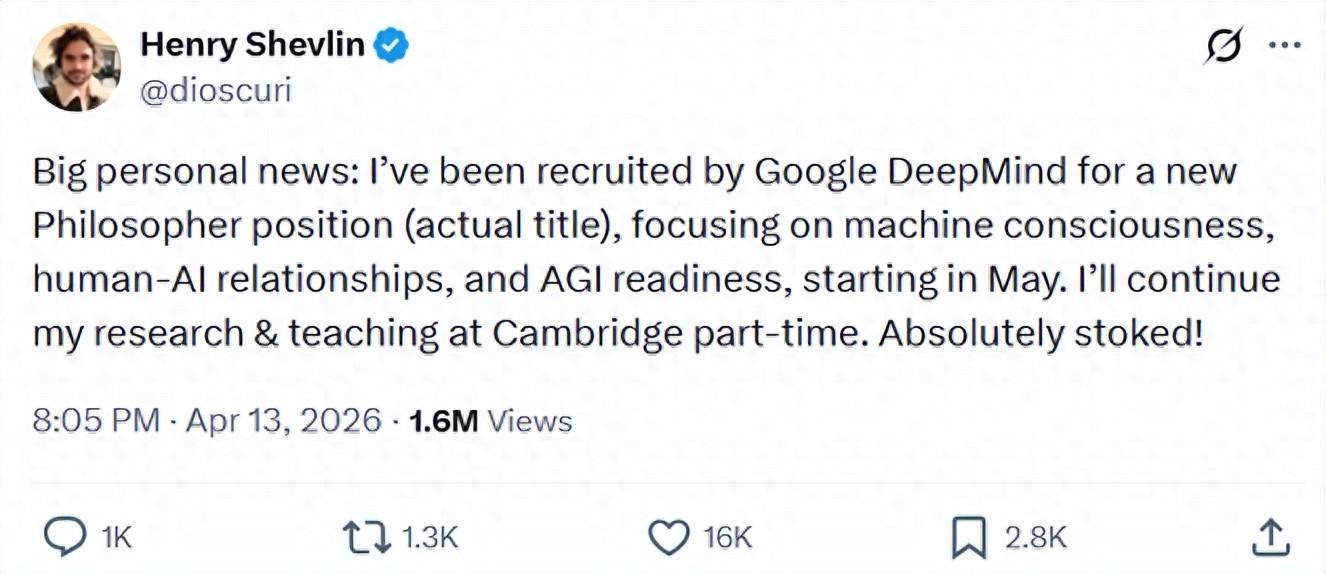 這幾天,一條推文在 X 上掀起了不小的水花。劍橋大學學者 Henry Shevlin 宣佈,他即將加入 Google DeepMind,職位名稱是“Philosopher”——哲學家,一個白紙黑字寫在錄用通知書上的正式頭銜。截至目前,這條推文被瀏覽了超過 160 萬次,點贊逾 1.6 萬。評論區的情緒從驚訝到困惑再到興奮都有,大家基本都在發出同樣的疑問:等等,AI 公司真的在招哲學家?